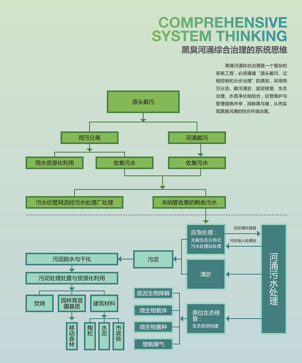 黑臭河涌綜合治理是一個復(fù)雜的系統(tǒng)工程,必須遵循“源頭截污、過程控制和分步治理”的原則,采用雨污分流、截污清淤、底泥修復(fù)、生態(tài)治理、水質(zhì)凈化相結(jié)合,運營維護與管理措施并舉,消除黑與臭,從而實現(xiàn)黑臭河涌的綜合環(huán)境治理。